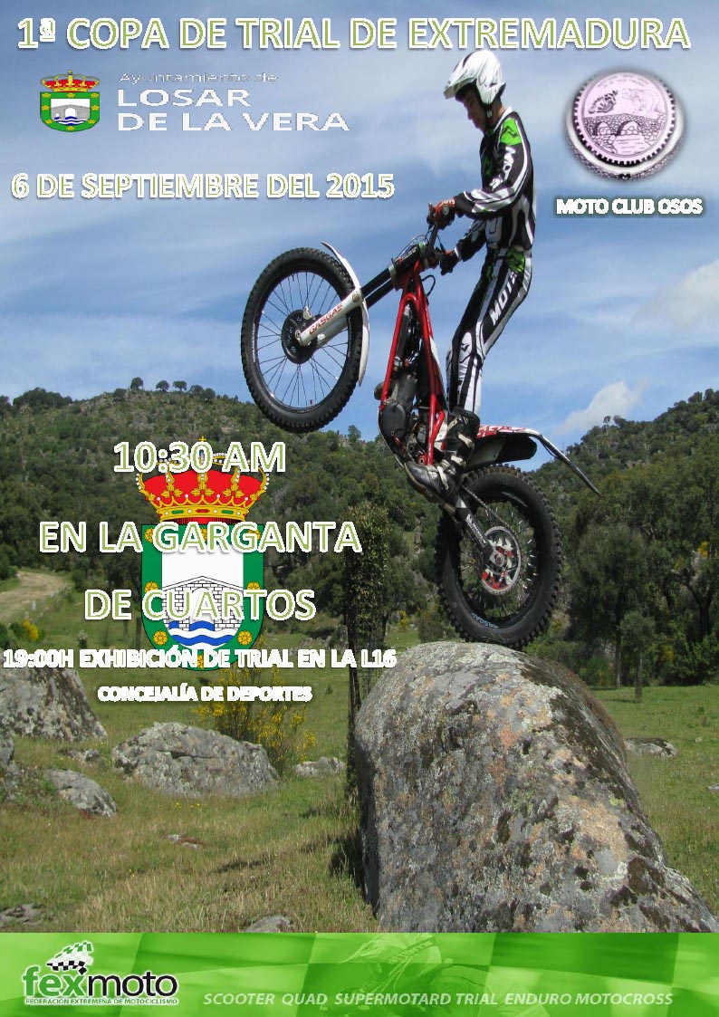 El próximo domingo dÃa 6 de Septiembre a las 10:30 de la mañana en el paraje de la Garganta Cuartos tendrá lugar la celebración de la Copa de Extremadura de Trial.